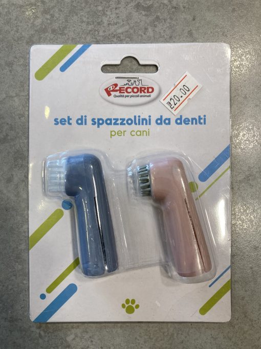 הסט כולל 2 מברשות שיניים: אחת עם זיפים לניקוי שיניים, השנייה עם גומי לחניכיים של החיה.